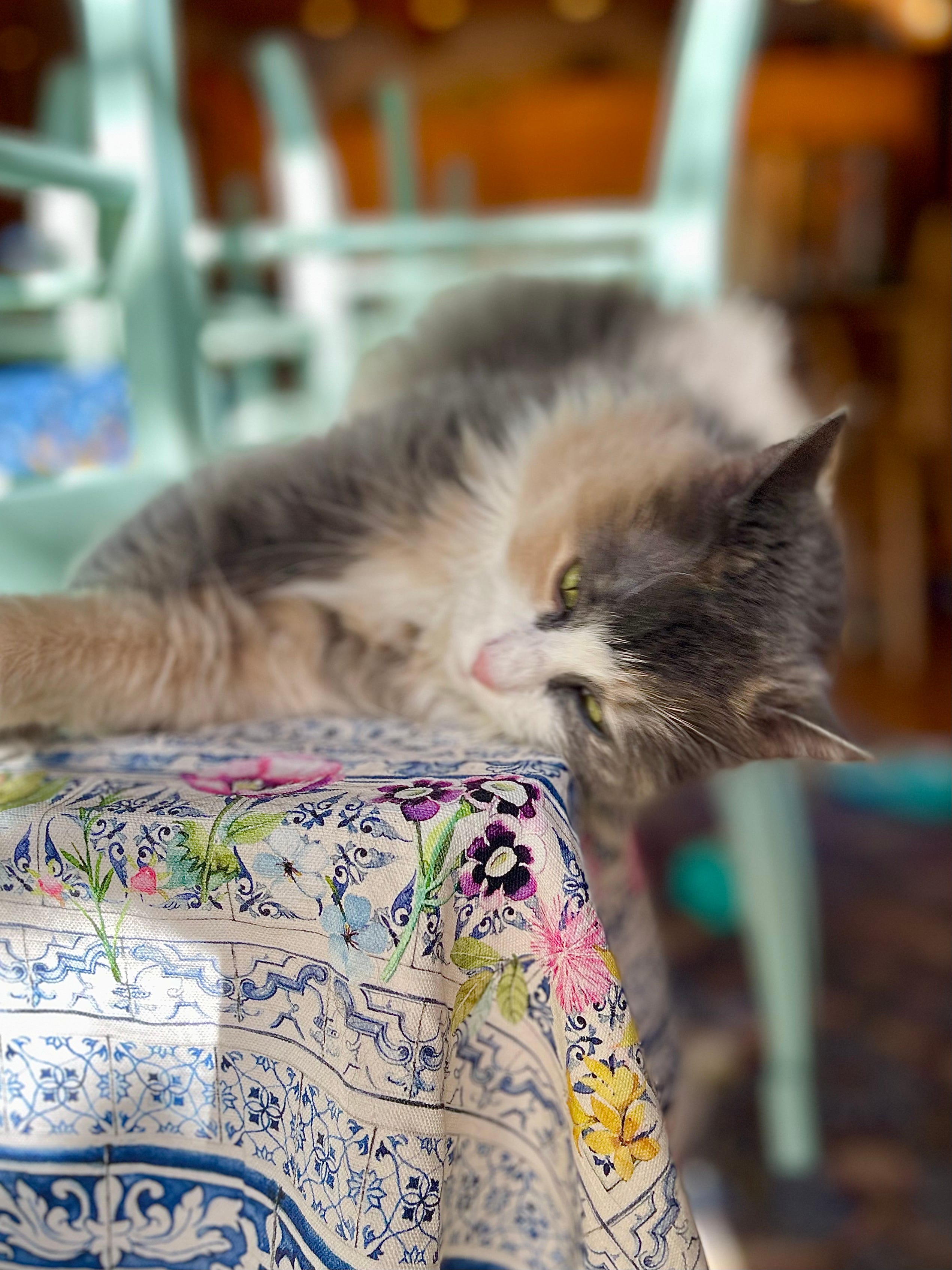This moment, if you are a cat, is an opportunity to roll around on the table with the upside down chairs and show that you are not intimidated and will just shed more -- on their table coverings.